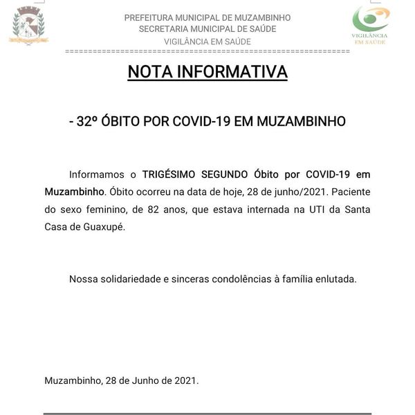 Informamos também a ocorrência do 32º óbito por Covid-19 em Muzambinho. Paciente do sexo feminino, de 82 anos de idade, conforme nota informativa em anexo.