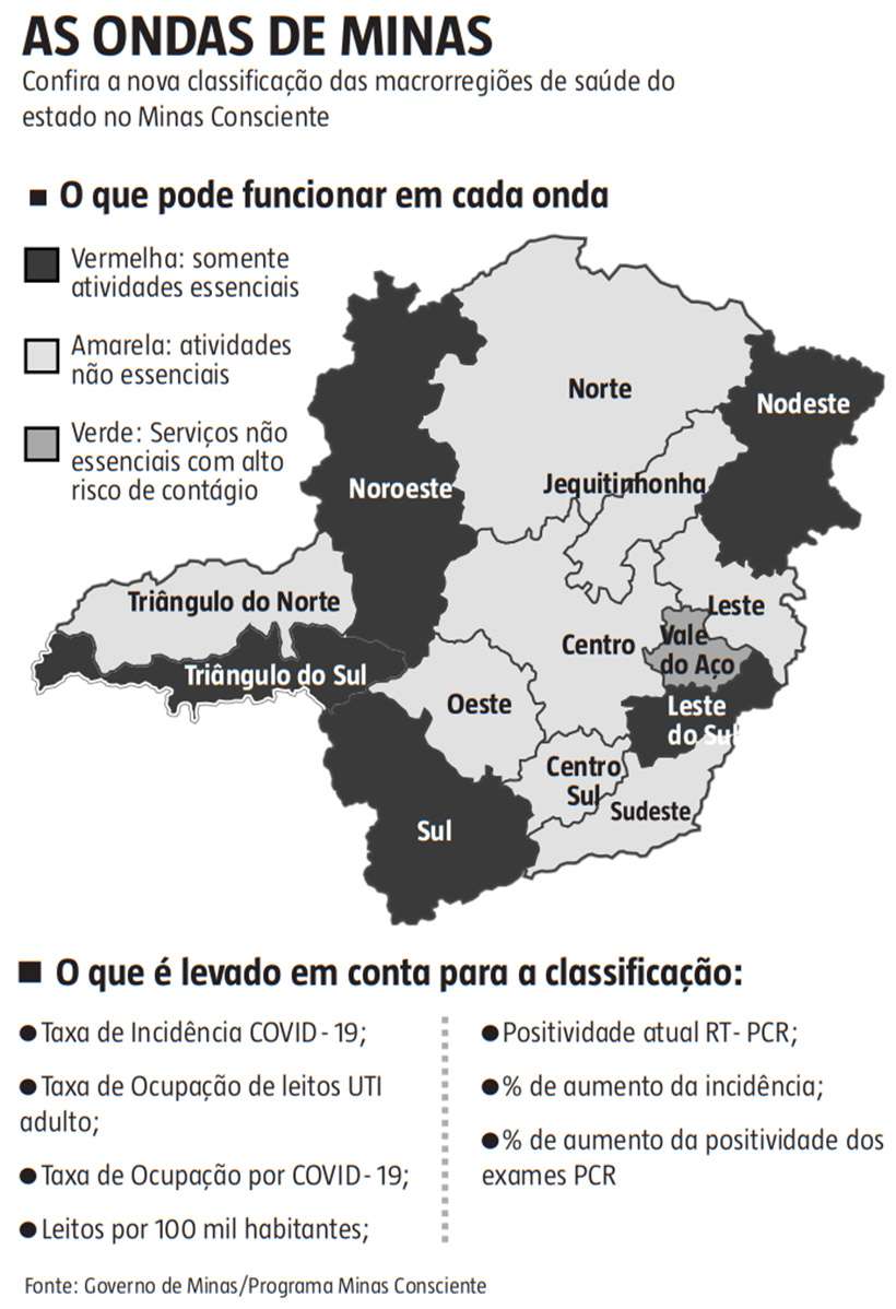 De acordo com o governo de Minas, o avanço nessas macrorregiões foi possível devido à queda consistente dos indicadores que medem a situação da pandemia no estado. A taxa de incidência da doença, que quantifica a circulação do vírus na sociedade, recuou 29% na última semana e de 36% nos últimos 14 dias.