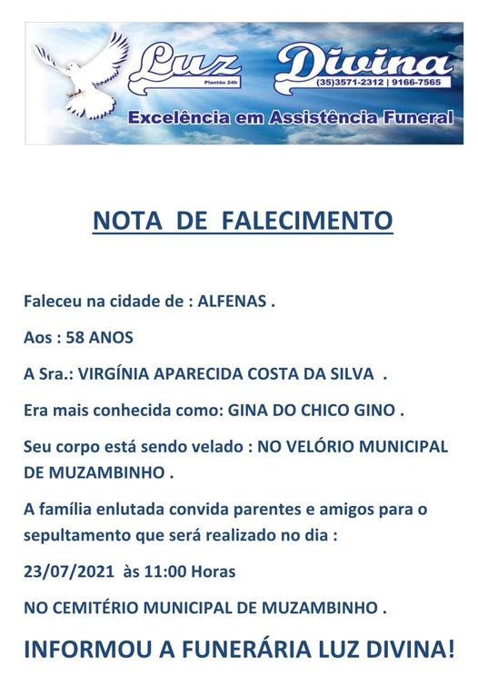 Mais Artigos DestaqueDiversos Primeira Superlua de 2026 pode ser vista neste sábado (03) DestaqueEventos e FestasNossa Cidade Venha participar da Feira Noturna de Muzambinho nesta sexta-feira, 02/01 DestaqueEconomiaTecnologia CNPJ terá letras e números a partir de julho de 2026DestaqueObituárioFaleceu aos 58 anos a Sra. Virgínia Ap Costa da Silva Redação23 de julho de 20211min0Informou a Funerária Luz DivinaA família enlutada, nossos sinceros sentimentos de pesares, que Deus os abençoe e conforte. Post Views: 950EnterroFuneráriaLuz DivinamorteobituárioSepultamentoVelório