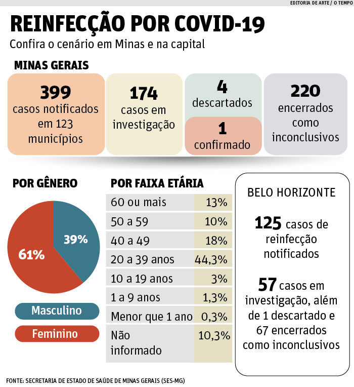 Em Minas, dos 399 casos notificados de reinfecção até agora, 125 (31,33%) foram em Belo Horizonte, segundo a Secretaria de Estado de Saúde (SES-MG). Desse total, 174 (43,61%) estão sendo investigados, sendo 57 deles (32,76%) na capital; quatro foram descartados, e apenas um foi confirmado, em Sabará. Outros 220 (55,13%) foram encerrados como inconclusivos.