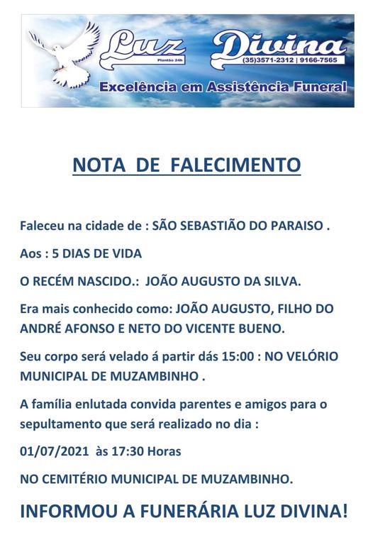 Mais Artigos DestaqueObituário Faleceu aos 93 anos a Sra. Leonizia Aro DestaqueObituário Faleceu aos 48 anos o Sr. Claudinei Aparecido Martins DestaqueObituário Faleceu aos 88 anos o Sr. Waldomiro VentureObituárioFaleceu aos 5 dias de vida João Augusto da Silva Redação1 de agosto de 20211min0Informou a Funerária Luz DivinaA família enlutada, nossos sinceros sentimentos de pesares, que Deus os abençoe e conforte. Post Views: 1.130EnterroFuneráriaLuz DivinamorteobituárioSepultamentoVelório