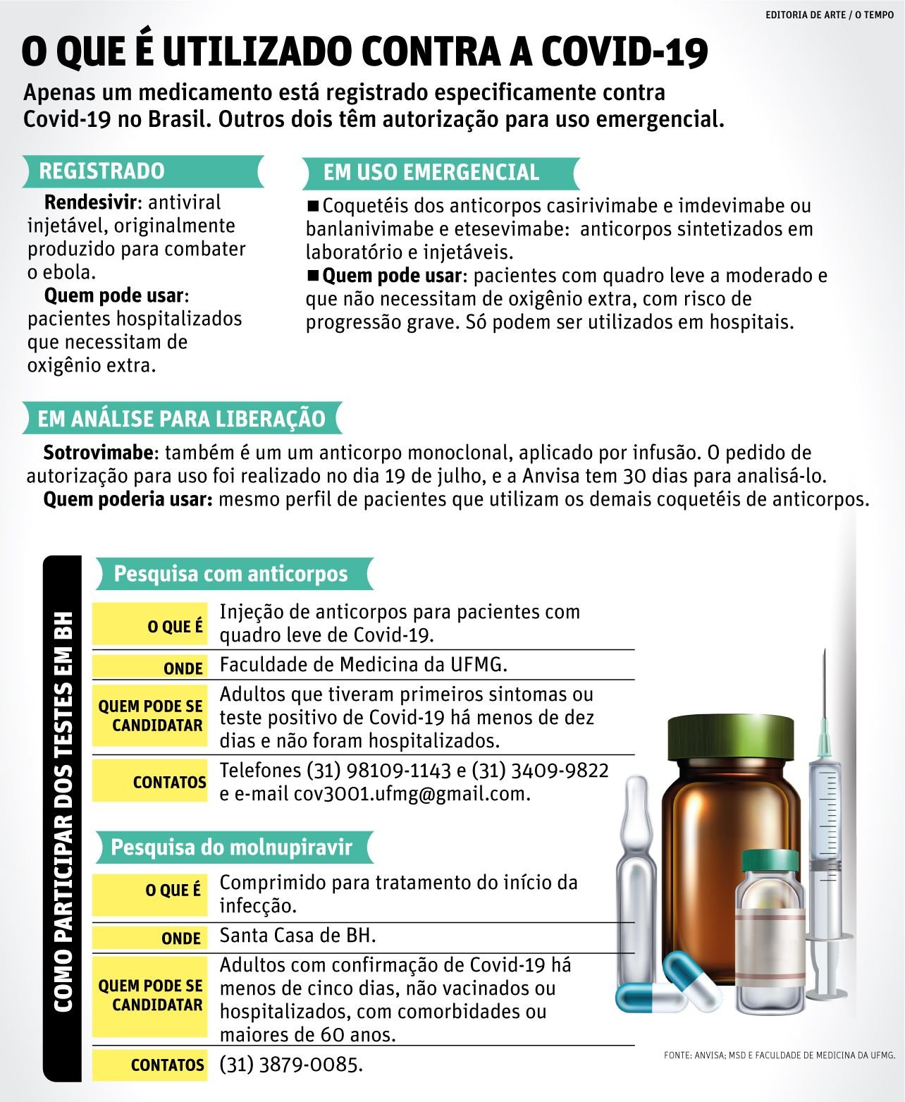 O primeiro medicamento contra a doença que chegou à fase três dos estudos clínicos no Brasil é o molnupiravir, que está em estudo em sete centros de saúde do país, inclusive na Santa Casa de BH. O remédio, produzido pela farmacêutica norte-americana MSD (também conhecida como Merck) é utilizado na forma de comprimido e, se as pesquisas revelarem sua eficácia, poderá ser utilizado por pacientes nos primeiros dias de sintomas para conter o agravamento, segundo a médica Marina Della Negra, uma das responsáveis pelas pesquisas.