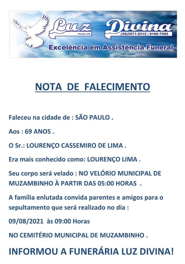 Mais Artigos DestaqueParceirosSaúde Sicredi irá promover formações para orientar entidades interessadas no Fundo Social AgronegócioDestaqueNossa Cidade Muzambinho recebe 1º Encontro Regional de Cafeicultura Sustentável em maio DestaqueEventos e FestasParceiros Dose Dupla de Respeito: Matheus Jorente e Samba Trupe agitam o “Sagrada Família – Bar do Edmar” neste sábado!DestaqueObituárioFaleceu aos 69 anos, o Sr. Lourenço Cassemiro de Lima Redação9 de agosto de 20211min0Informou a Funerária Luz DivinaA família enlutada, nossos sinceros sentimentos de pesares, que Deus os abençoe e conforte. Post Views: 959EnterroFuneráriaLuz DivinamorteobituárioSepultamentoVelório