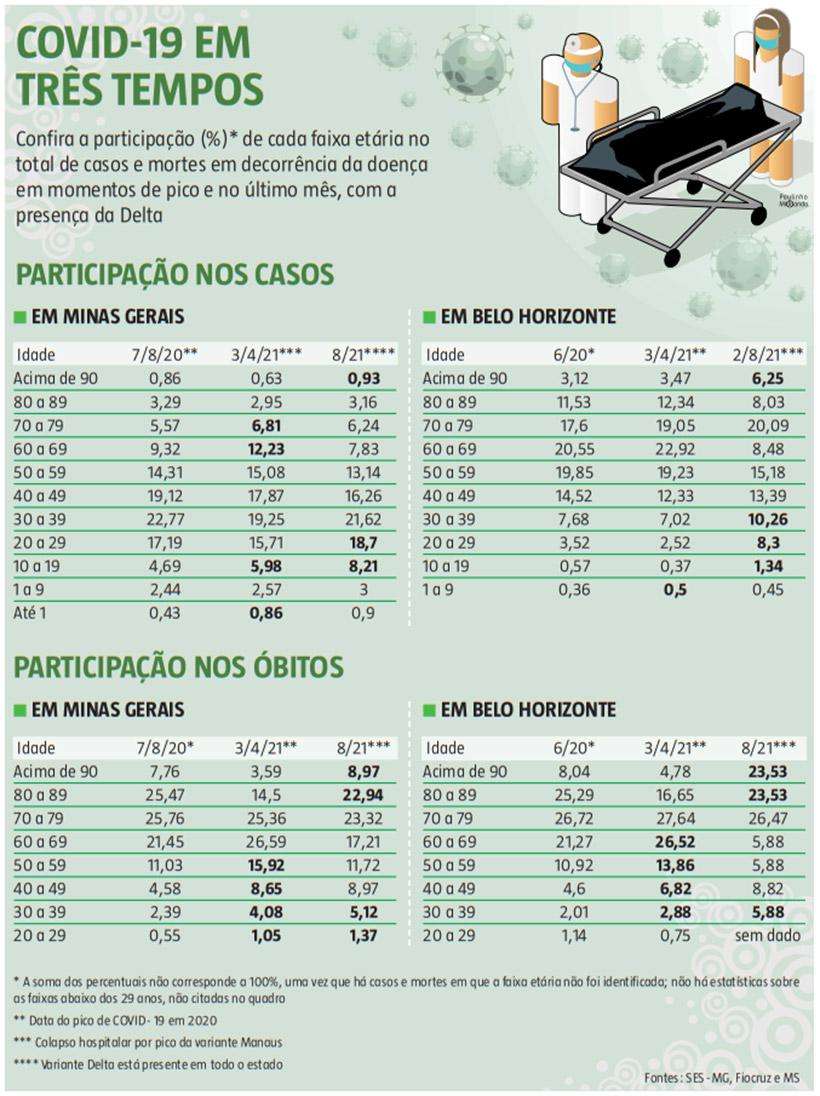 Por enquanto, as pastas da Saúde de Minas Gerais e de Belo Horizonte indicam um decréscimo de casos e óbitos no cômpito geral da população, mas confirmam a presença da Delta, sem, contudo, poder afirmar ser essa a causa de faixas etárias mais altas voltarem a ser mais atingidas. Estatísticas da Secretaria de Estado de Saúde de Minas Gerais (SES-MG), em comparativo de três períodos de destaque dentro da pandemia por sua gravidade – o pico de infecções de 2020 (junho em BH, e julho e agosto, em MG), o colapso hospitalar e explosão de casos, entre março e abril deste ano, e o mês de agosto –, mostram que a participação dos idosos em casos e mortes vem se ampliando.