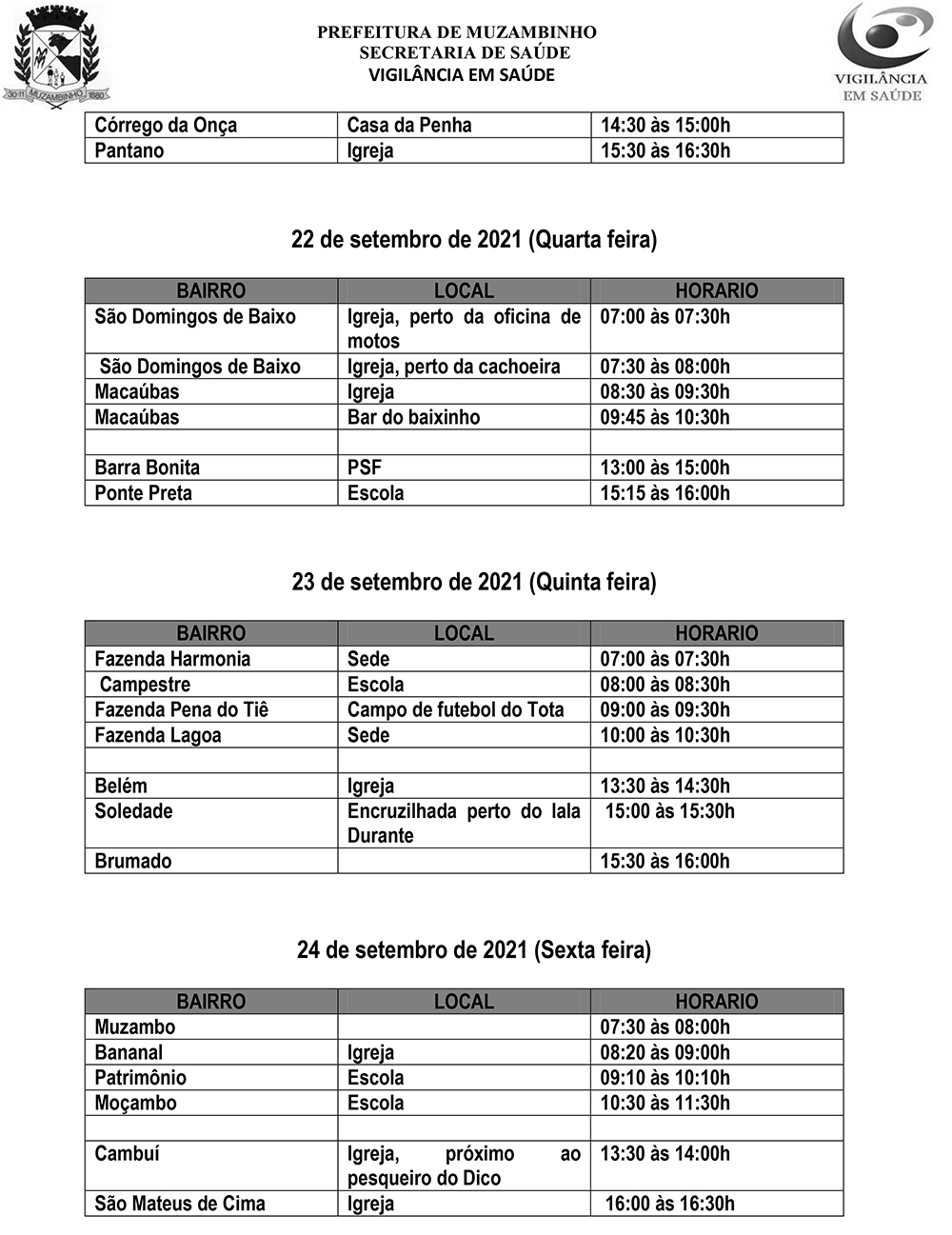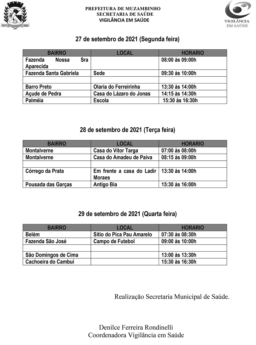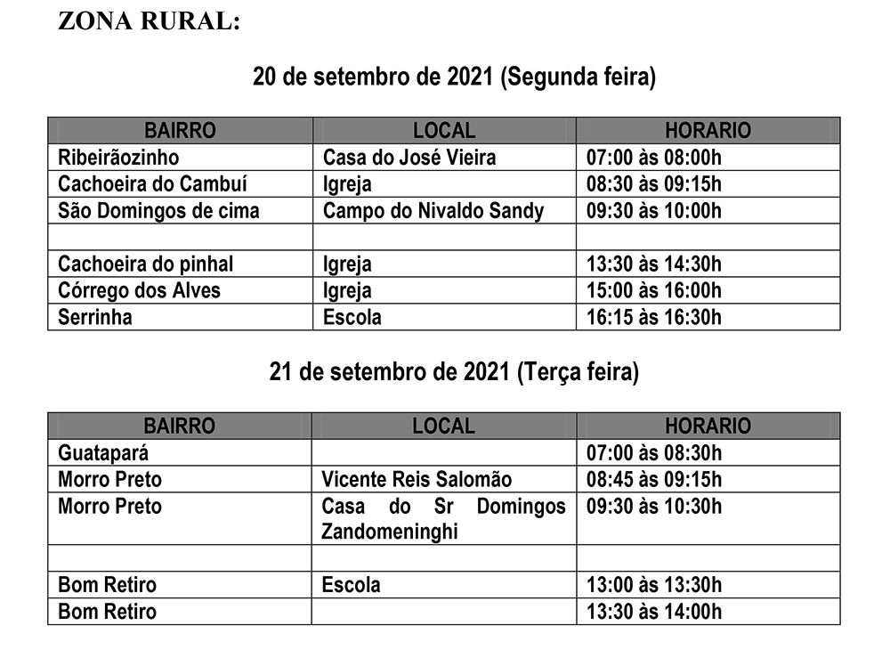 A Secretaria Municipal de Saúde, através do serviço de Vigilância em Saúde, comunica a toda população que estará realizando a Campanha de Vacinação Antirrábica para cães e gatos, no período de 20 a 29 de setembro (zona rural) e 9 e 10 de outubro na zona urbana.