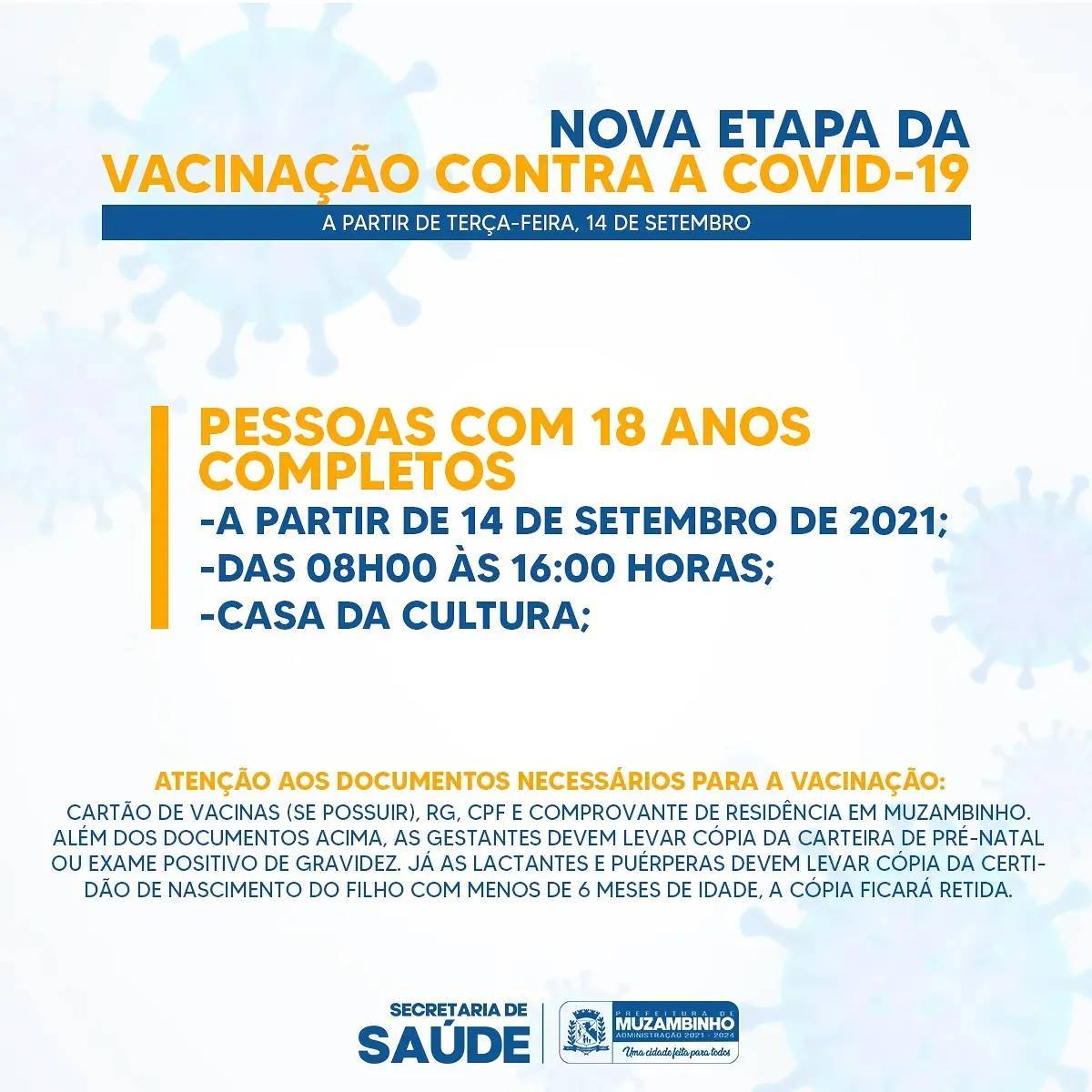 Documentos Obrigatórios para a Vacinação: Cartão de Vacinas (se possuir), RG, CPF e COMPROVANTE DE RESIDÊNCIA EM MUZAMBINHO
