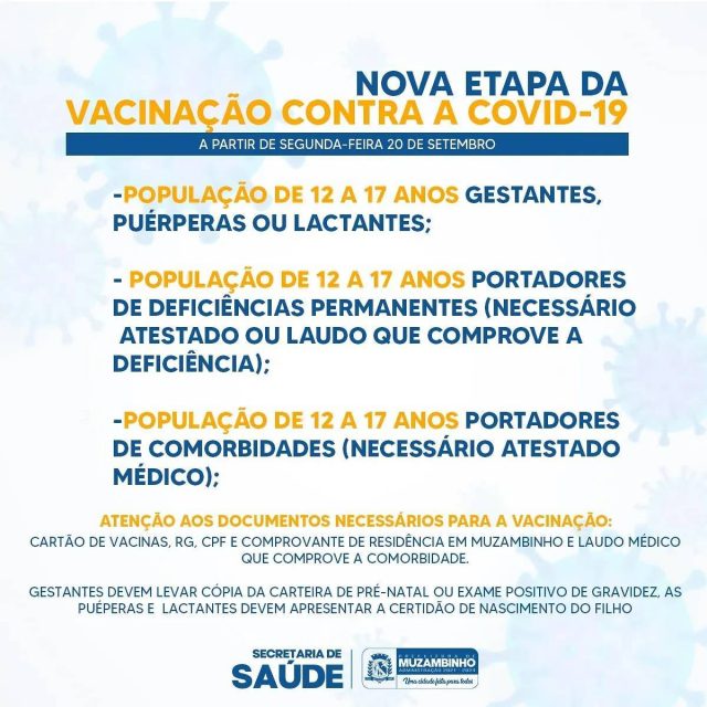 Documentos Obrigatórios para a Vacinação: Cartão de Vacinas (se possuir), RG, CPF, COMPROVANTE DE RESIDÊNCIA EM MUZAMBINHO e ATESTADO MÉDICO. Gestantes devem levar cópia da carteira de pré-natal ou exame positivo de gravidez. As Puérperas e Lactantes devem apresentar a certidão de nascimento do filho.