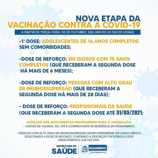 -DOSE DE REFORÇO: *PROFISSIONAIS DE SAÚDE* (que receberam a segunda dose *ATÉ 31/03/2021*);