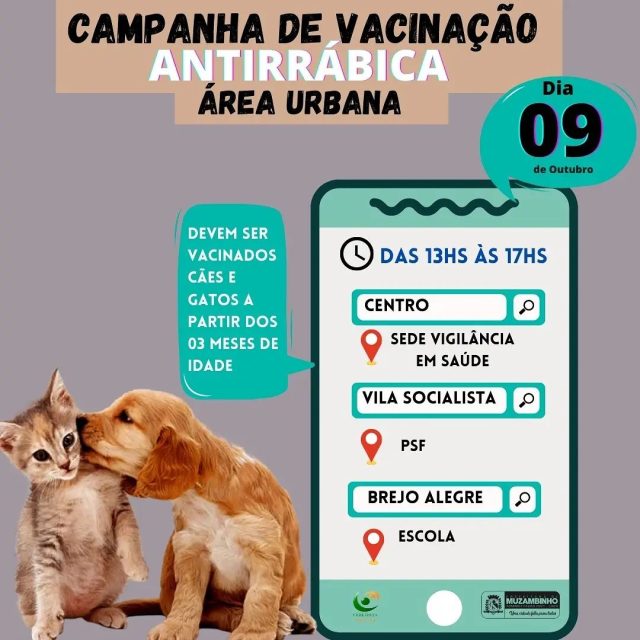 A Secretaria Municipal de Saúde, através do serviço de Vigilância em Saúde, comunica a toda população que estará realizando a Campanha de Vacinação Antirrábica para cães e gatos, na zona urbana nos dias 09 e 10 de outubro (sábado e domingo).