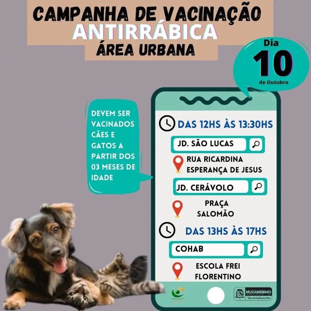 É neste sábado e domingo, 09 e 10/10, Campanha de Vacinação Antirrábica para cães e gatos, Zona Urbana de Muzambinho.