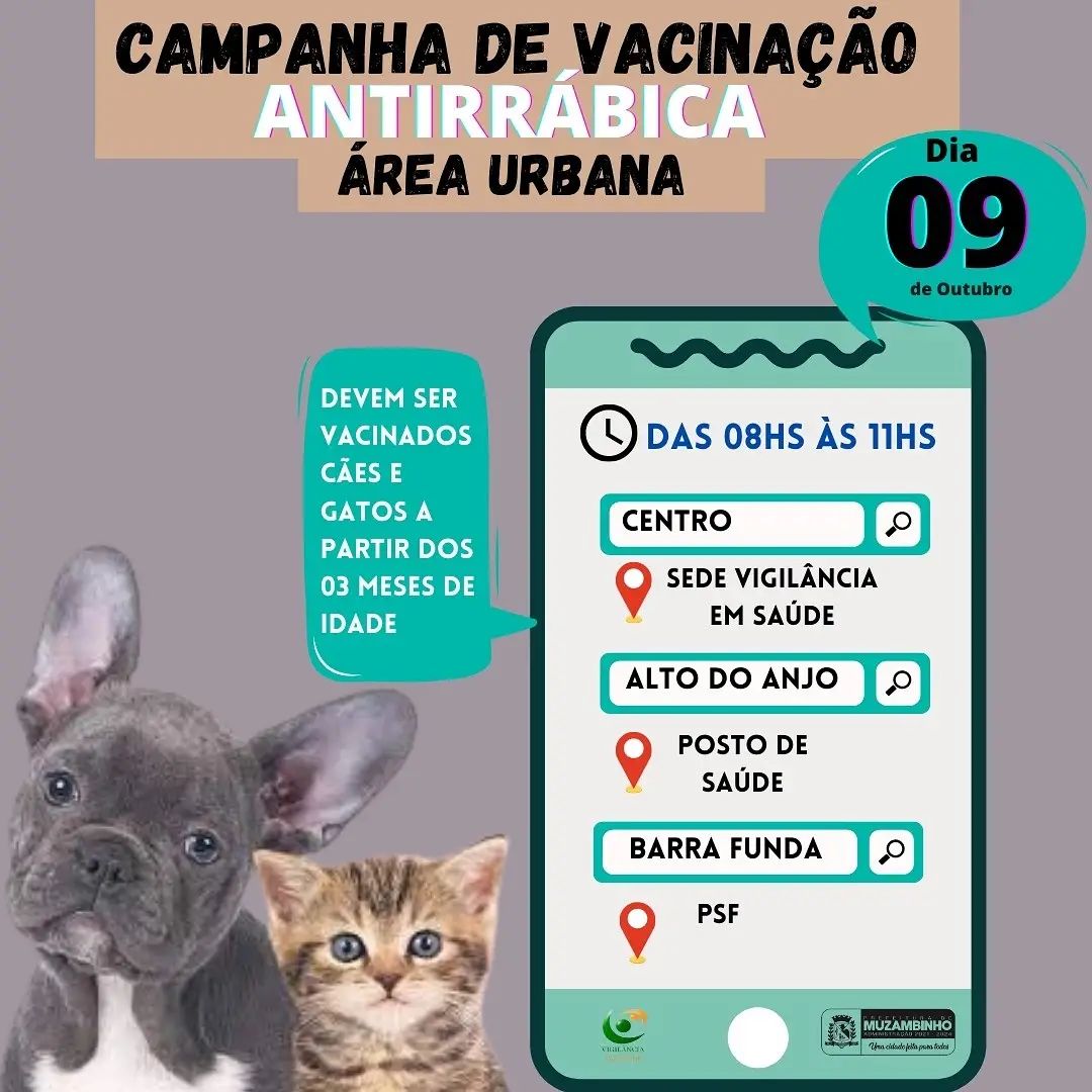 A Secretaria Municipal de Saúde, através do serviço de Vigilância em Saúde, comunica a toda população que estará realizando a Campanha de Vacinação Antirrábica para cães e gatos, na zona urbana nos dias 09 e 10 de outubro (sábado e domingo).