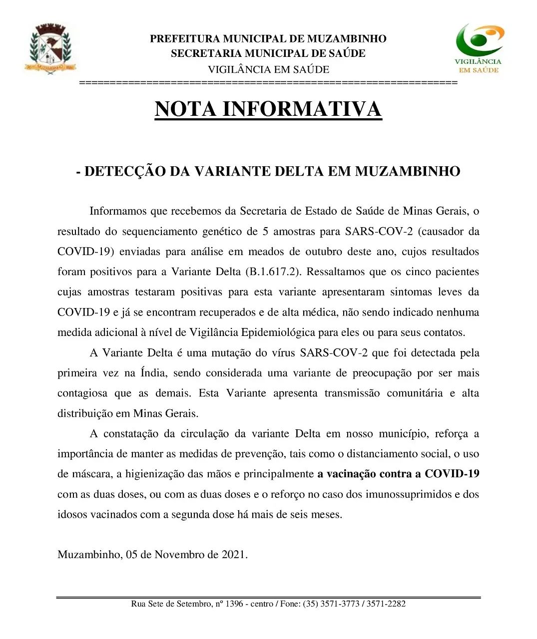 A Prefeitura Municipal de Muzambinho recebeu da Secretaria de Estado de Saúde de Minas Gerais o sequenciamento genético de 5 amostras positivas para a Variante Delta, conforme Nota Informativa em anexo.