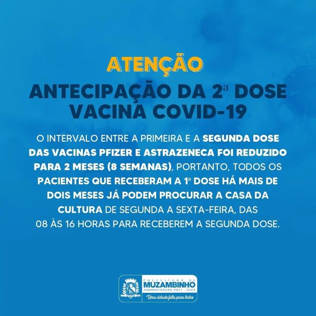 Mais Artigos DestaqueReflexão O barulho do mundo e o silêncio que nos falta DestaqueLegislativoNossa CidadePolítica Confira as falas da 6ª Reunião Ordinária de Vereadores em Muzambinho – 16/03/2026 DestaqueObituário Faleceu aos 85 anos o Sr. Sebastião PinheiroDestaqueNossa CidadeSaúdeEm Muzambinho, Antecipacão de Vacina para vacinados com Pfizer e Astrazeneca. Redação16 de novembro de 20211min0Todos que receberam a primeira dose a mais de dois meses já podem tomar a segunda dose. Post Views: 917AstraZenecadosepfizerPrefeituraVacina