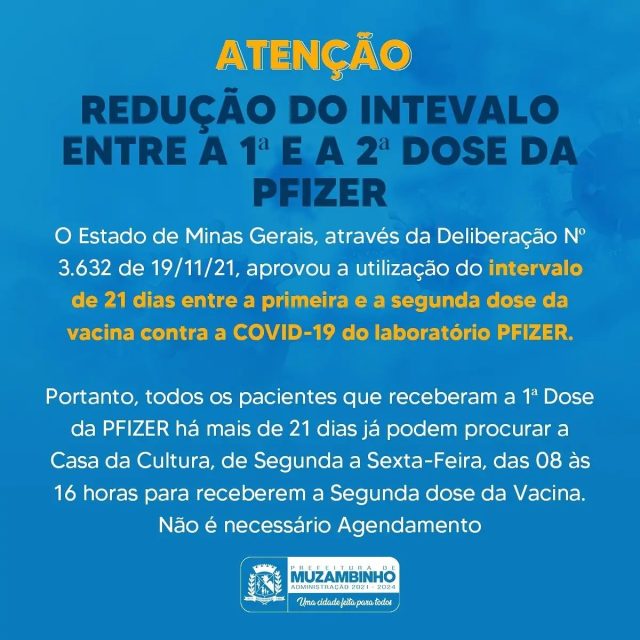 Mais Artigos Cozinha e CulináriaDestaqueNossa Cidade Tradição e sabor: Rachel Ovos abre temporada de Páscoa 2026 em Muzambinho AgronegócioDestaqueParceiros Lideranças da cafeicultura destacam oportunidades e desafios do setor na abertura da Femagri 2026 DestaqueDiversosNosso Estado Clínicas médicas de Minas paralisam atividades em protesto contra renovação automática da CNHDestaqueNossa CidadeSaúdeIntervalo entre 1ª e 2ª dose da Pfizer diminui para 21 dias. Redação23 de novembro de 20211min0Vacine-se - Local: Casa da Cultura, de Segunda a Sexta-feira, das 8h às 16h Post Views: 1.081COVID-19Vacina