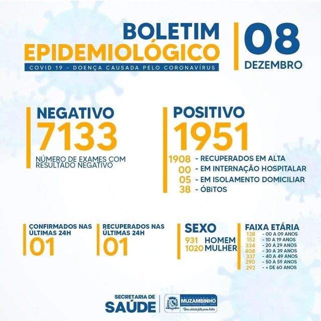 Foi confirmado o resultado positivo para Covid-19 de um paciente nesta quarta-feira, 08/12, do sexo feminino.