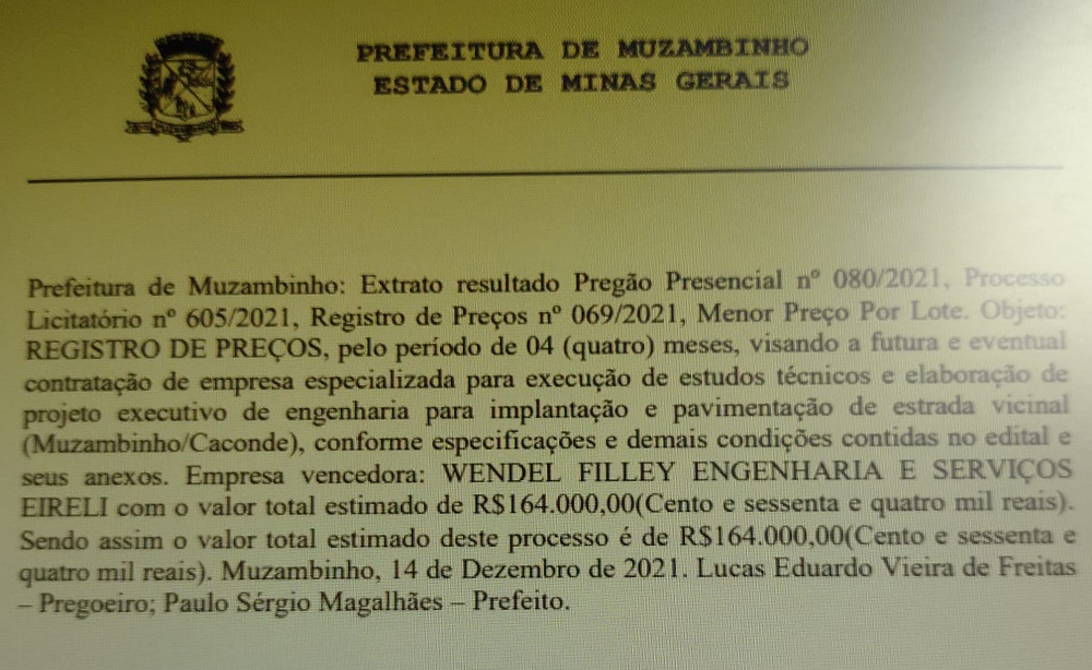 Prefeitura de Muzambinho faz Pregão de Projeto de Engenharia Muzambinho a Caconde.