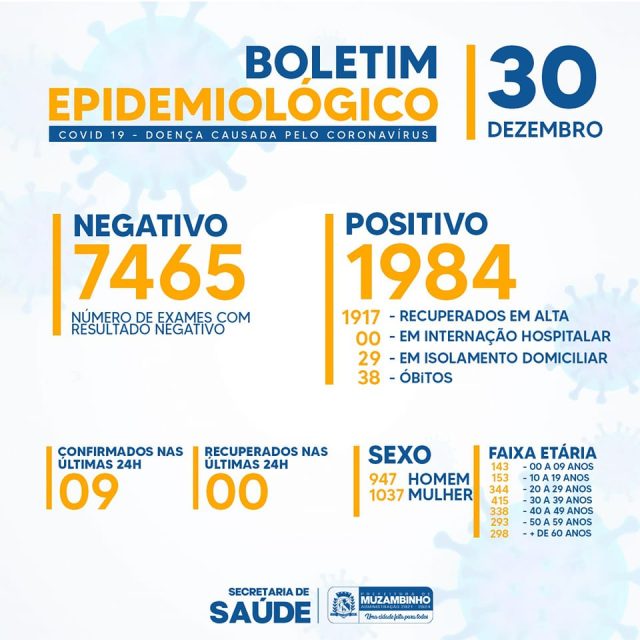 Confirmamos o resultado positivo para Covid-19 de nove pacientes hoje (30/12), cinco do sexo masculino e quatro do sexo feminino.