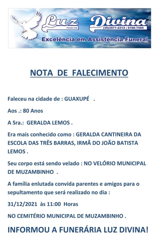 Mais Artigos DestaquePrevisão do Tempo Muzambinho e mais de 400 cidades estão em alerta para chuvas intensas nesta terça DestaqueReflexão O barulho do mundo e o silêncio que nos falta DestaqueLegislativoNossa CidadePolítica Confira as falas da 6ª Reunião Ordinária de Vereadores em Muzambinho – 16/03/2026DestaqueObituárioFaleceu aos 80 anos, a Sra. Geralda Lemos. Redação31 de dezembro de 20211min0Informou a Funerária Luz DivinaA família enlutada, nossos sinceros sentimentos de pesares, que Deus os abençoe e conforte. Post Views: 1.102EnterroFuneráriaLuz DivinamorteobituárioSepultamentoVelório