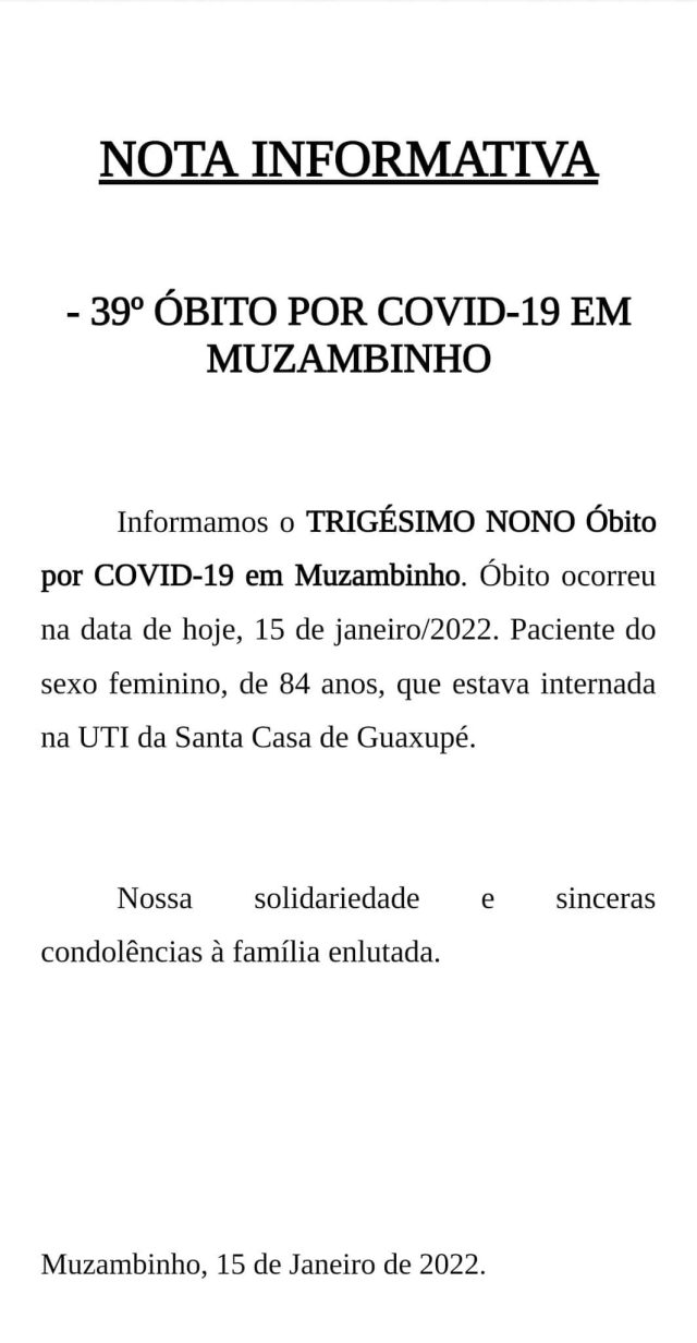 Comunicamos também o 39º óbito por Covid-19 em Muzambinho.