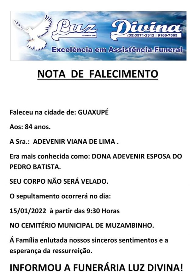 Mais Artigos DestaqueObituário Faleceu aos 35 anos Fernanda Alexandra da Cruz DestaqueDiversosNossa Cidade Muzambinho não terá coleta de lixo nesta sexta-feira (03) AcidenteDestaque Empresária de Muzambinho morre em grave acidente na BR-146DestaqueObituárioFaleceu aos 84 anos, a Sra. Adevenir Viana de Lima Redação15 de janeiro de 20221min0Informou a Funerária Luz DivinaA família enlutada, nossos sinceros sentimentos de pesares, que Deus os abençoe e conforte. Post Views: 1.081EnterroFuneráriaLuz DivinamorteobituárioSepultamentoVelório