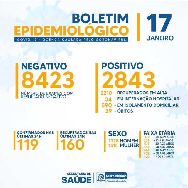 Foi Confirmado o resultado positivo para Covid-19 de cento e dezenove pacientes nesta segunda-feira, 17/01, sendo: 50 do sexo masculino e 69 do sexo feminino.