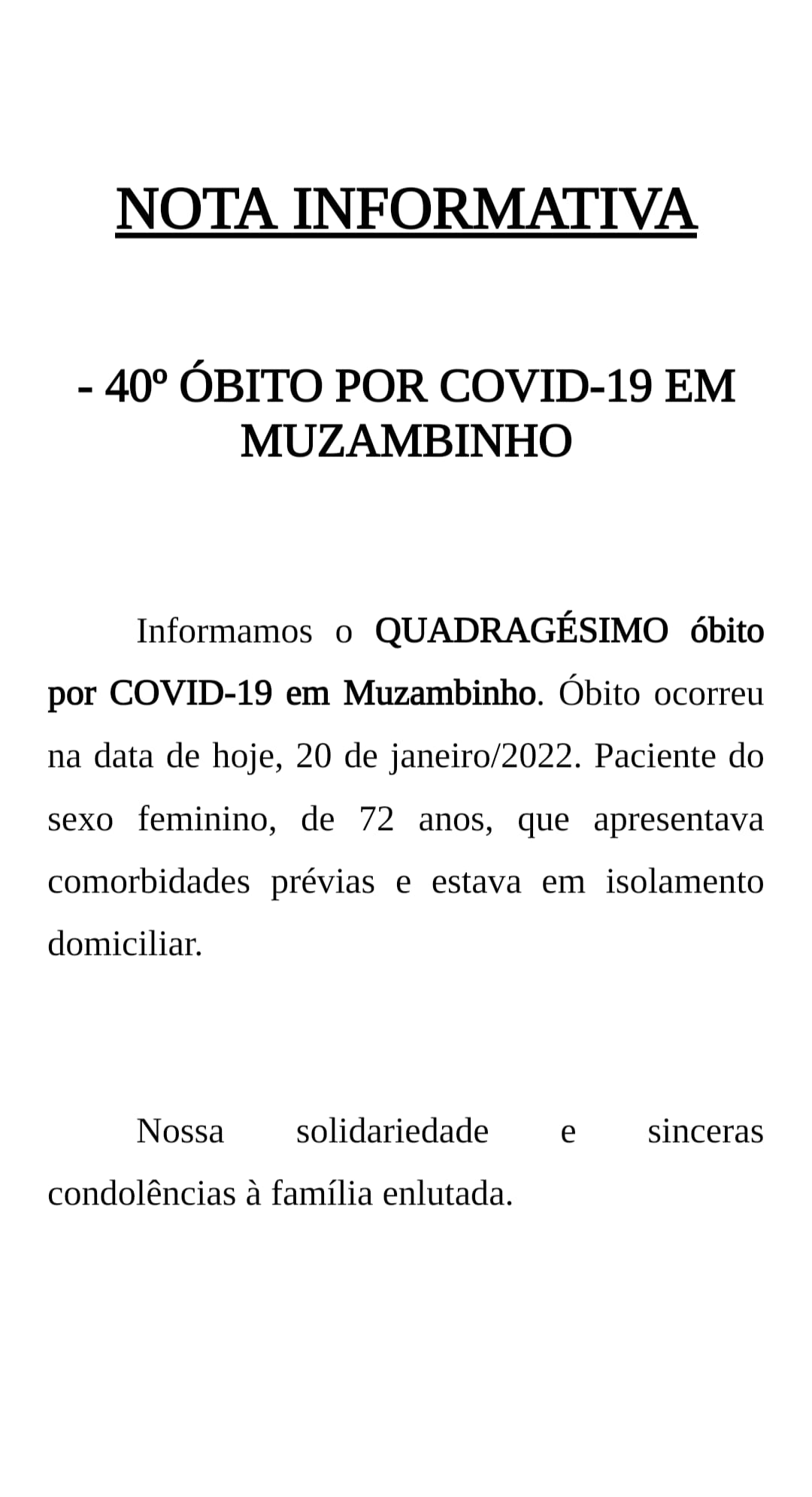 Foi comunicado também o 40º óbito por Covid-19 de Muzambinho, conforme nota informativa em anexo.