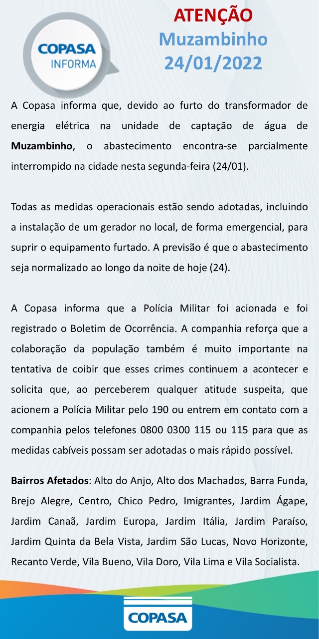 O abastecimento de água encontra-se parcialmente interrompido devido ao furto do transformador de energia elétrica na unidade de capacitação de água em Muzambinho