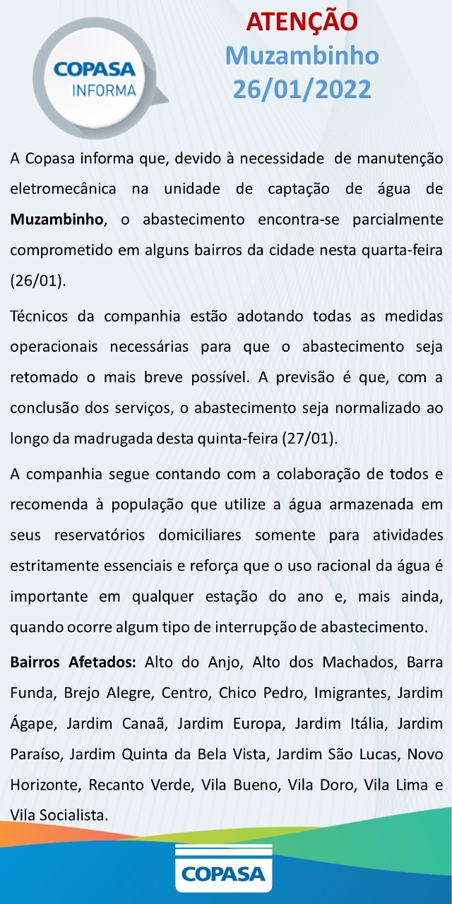 COPASA comunica que alguns bairros ainda estão com abastecimento de água comprometido em Muzambinho