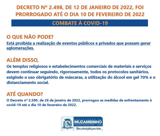 Prefeitura de Muzambinho prorroga Decreto até 10/02/22.