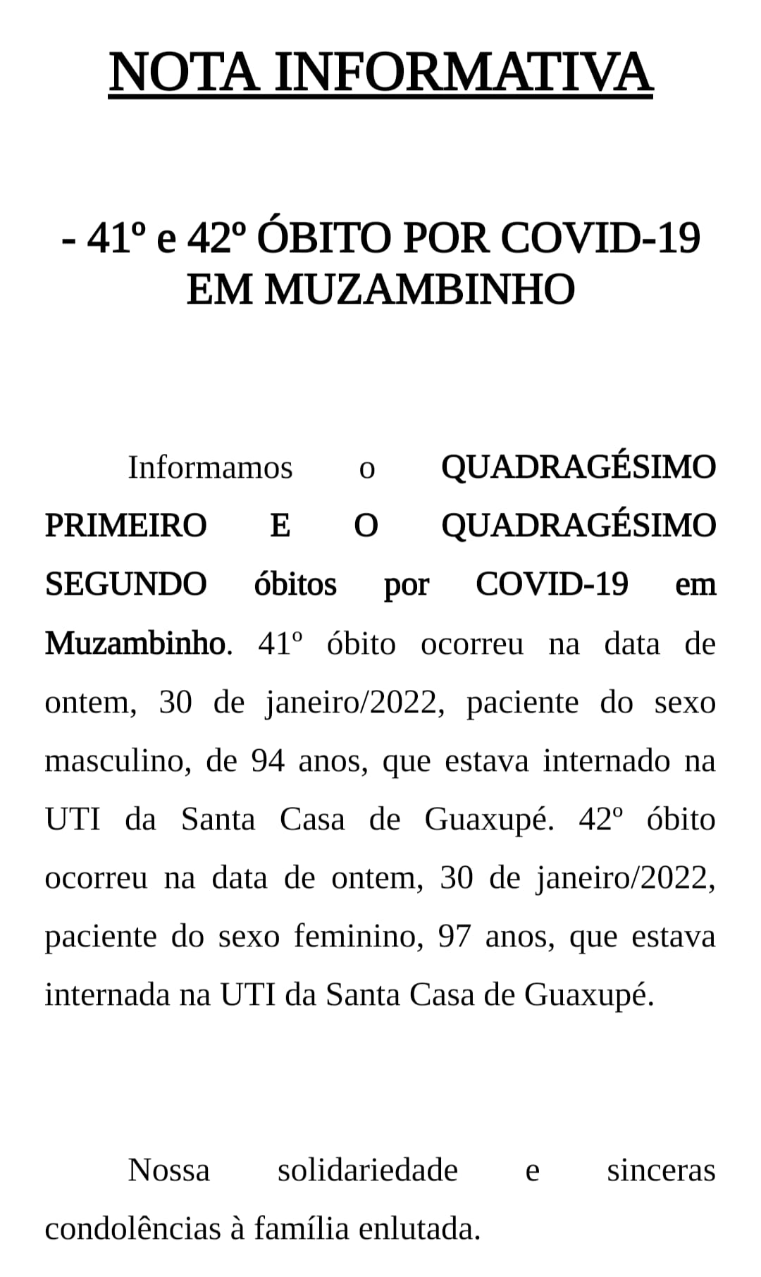 Comunicamos também o 41º e 42º óbitos por Covid-19 do município de Muzambinho, conforme nota informativa em anexo.