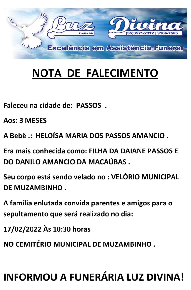 Mais Artigos DestaqueEventos e FestasNossa Cidade Venha participar da Feira Noturna de Muzambinho nesta sexta-feira, 12/12 DestaqueObituário Faleceu aos 71 anos a Sra. Elga de Almeida Gonçalves DestaqueEventos e FestasLegislativoNossa Cidade Câmara de Muzambinho homenageia profissionais da saúde em solenidade especialDestaqueObituárioFaleceu aos 3 meses, Heloísa Maria Passos Amâncio. Redação17 de fevereiro de 20221min0Informou a Funerária Luz Divina A família enlutada, nossos sinceros sentimentos de pesares, que Deus os abençoe e conforte. Post Views: 995EnterroFuneráriaLuz DivinamorteobituárioSepultamentoVelório