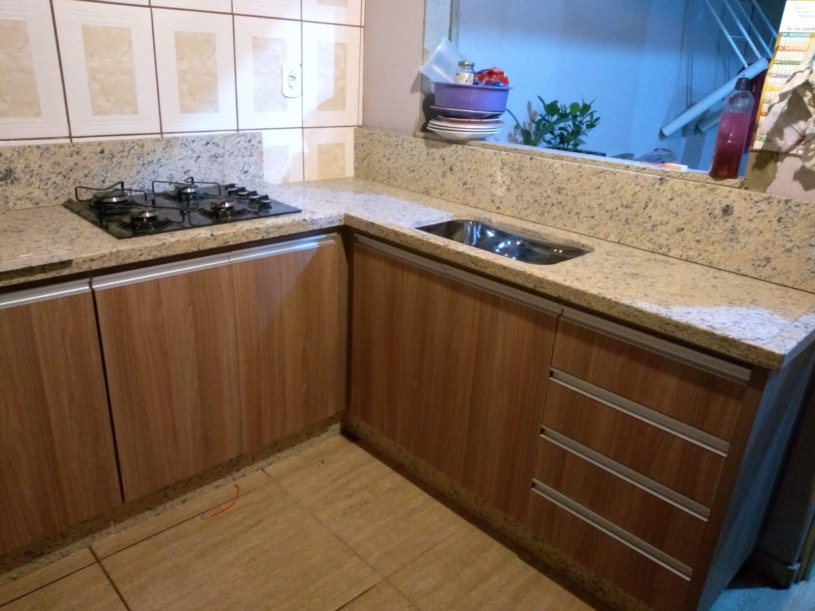 Cozinha feita na cor amadeirada, em 100% MDF com gabinetes e prateleiras em MDF de 15 mm, e portas e gavetas no MDF de 18 mm e fundos no MDF de 6mm. Utilizando dobradiças FGV com amortecedor nas portas, corrediças FGV telescópicas reforçadas nas gavetas, e puxador em barra com ponteiras, tapa furos e fita de bordo, além de toda instalação completa.