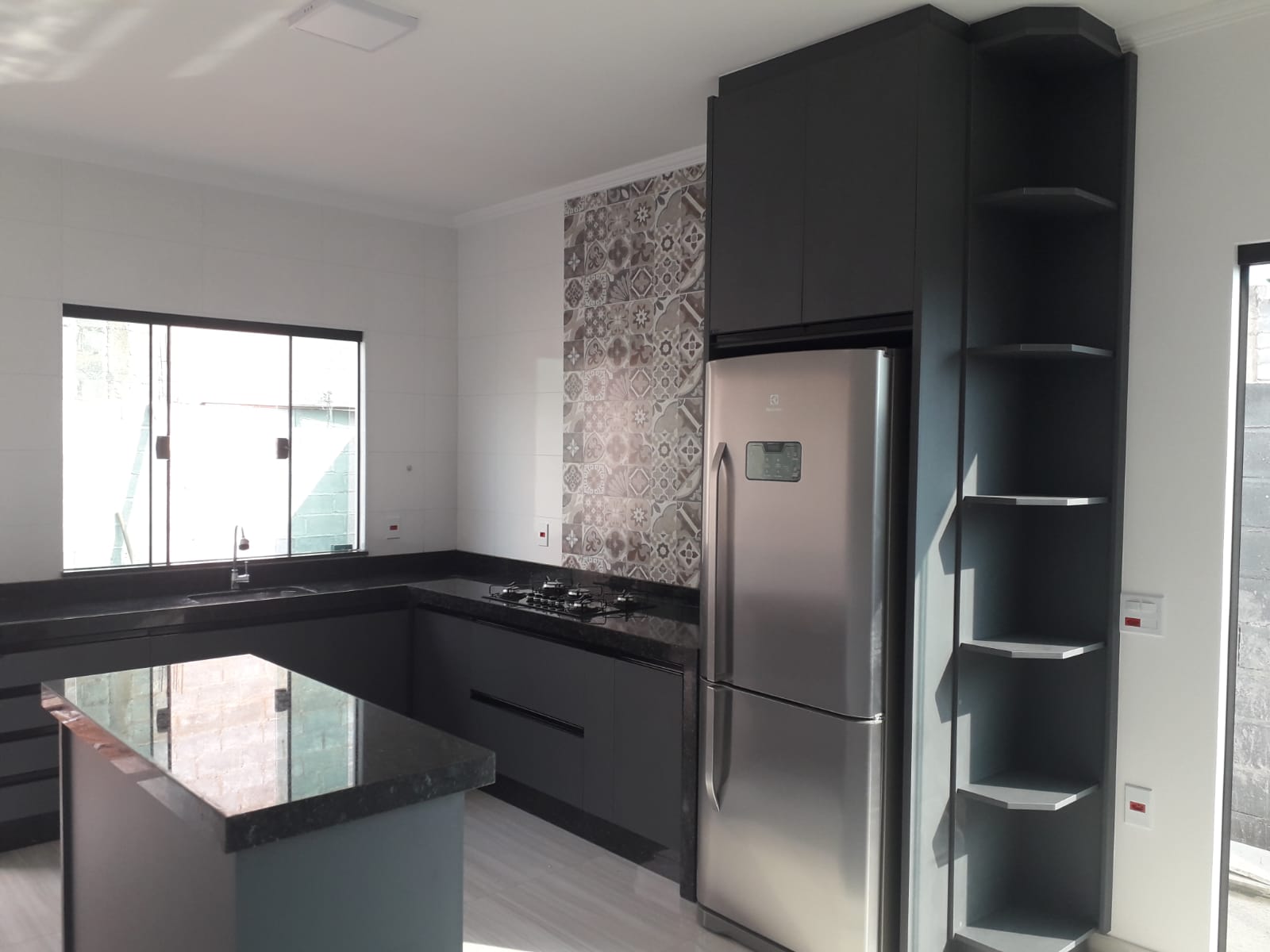 Cozinha em 100% MDF, na cor grafitto, com caixotes e gabinetes no MDF de 15 mm, portas e gavetas no MDF de 18 mm e fundos no MDF de 6 mm. Acabamento em cantoneira na lateral de geladeira. Utilizando corrediças FGV telescópicas reforçadas, e dobradiças FGV com amortecedor, puxador em barra com ponteiras na cor preta, incluindo acabamentos como tapa furo, fita de bordo e instalação completa.