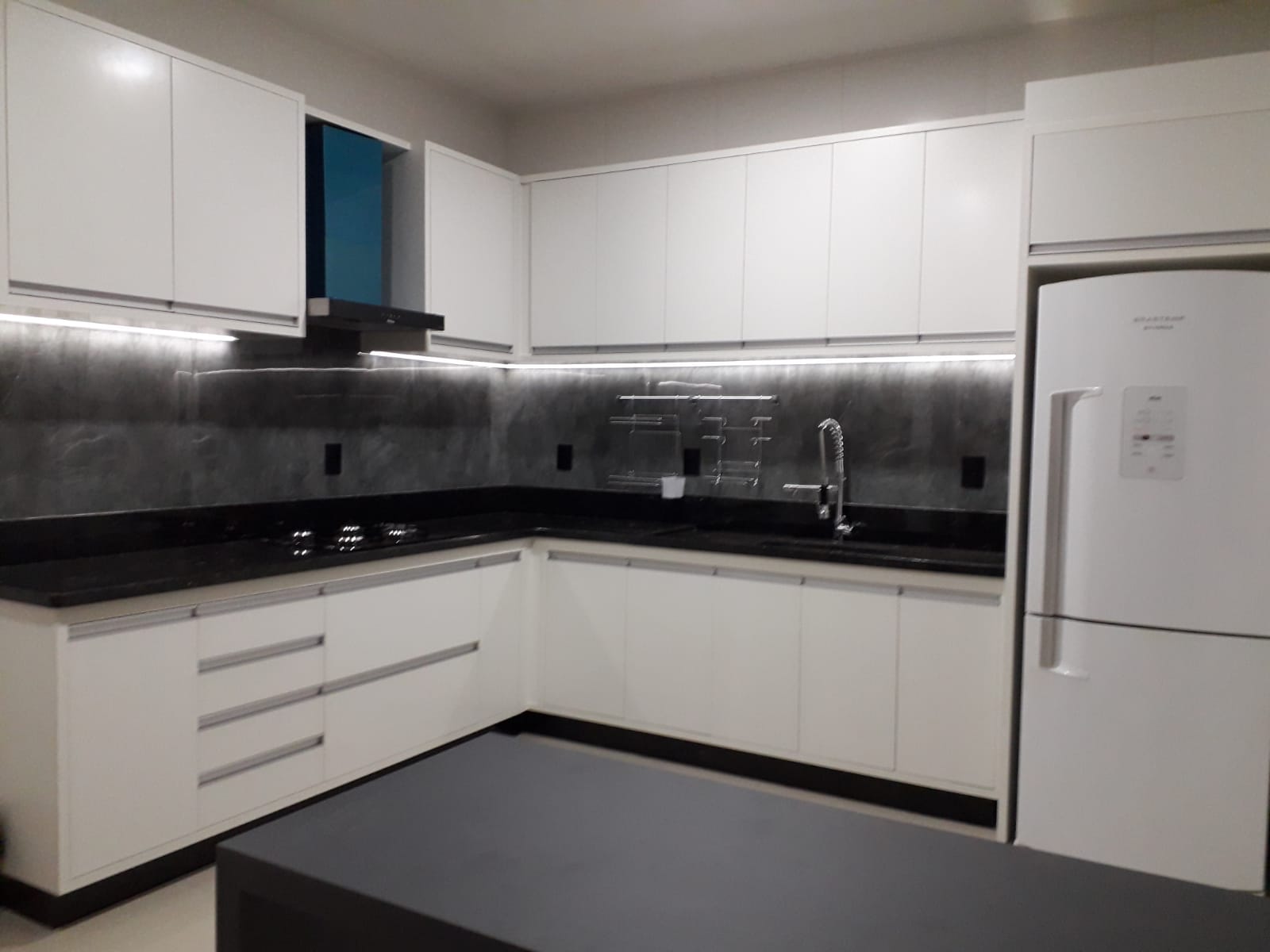 Cozinha feita sob medida, em 100% MDF na cor branco liso duratex. Gabinetes e prateleiras no MDF de 15 mm, portas e gaveteiros no MDF de 18 mm e fundos no MDF de 6 mm. Mesa amadeirada no cor grafito em expessura de 5 cm reforçada.