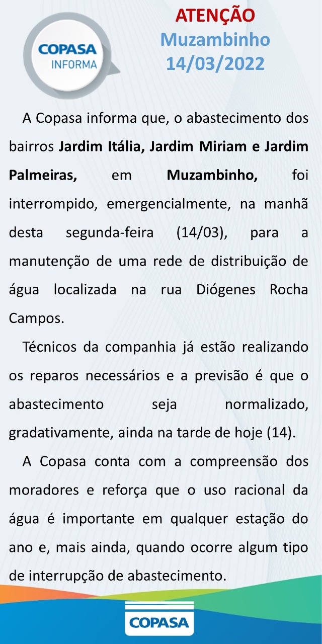 Mais Artigos DestaquePrevisão do Tempo Tempestade e granizo: Brasil tem alerta para 18 estados e o DF; veja a lista Diversos Café e longevidade: a dose diária que faz bem à saúde DestaqueEconomia Segunda parcela do 13º salário deve ser paga nesta semanaDestaqueDiversosNossa CidadeCOPASA informa interrupção no fornecimento de água devido manutenção em rede de distribuição Redação14 de março de 20221min0Bairros afetados: Jardim Itália, Jardim Miriam e Jardim Palmeiras Post Views: 662abastecimentoAguacopasa