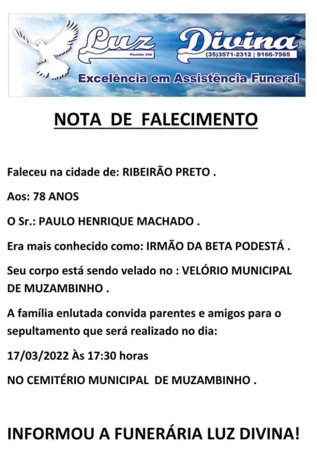 Mais Artigos AgronegócioDestaque Café em Foco, 16/03/26, Cotações e Informações da Cafeicultura DestaqueEventos e FestasNossa Cidade Artesãos de Muzambinho serão homenageados em sarau especial na Casa da Cultura DestaqueNossa CidadeReligião Igreja Presbiteriana Independente de Muzambinho celebra 103 anos com culto especialDestaqueObituárioFaleceu aos 78 anos, Paulo Henrique Machado Redação17 de março de 20221min0Informou a Funerária Luz Divina Post Views: 867EnterroFuneráriaLuz DivinamorteobituárioSepultamentoVelório
