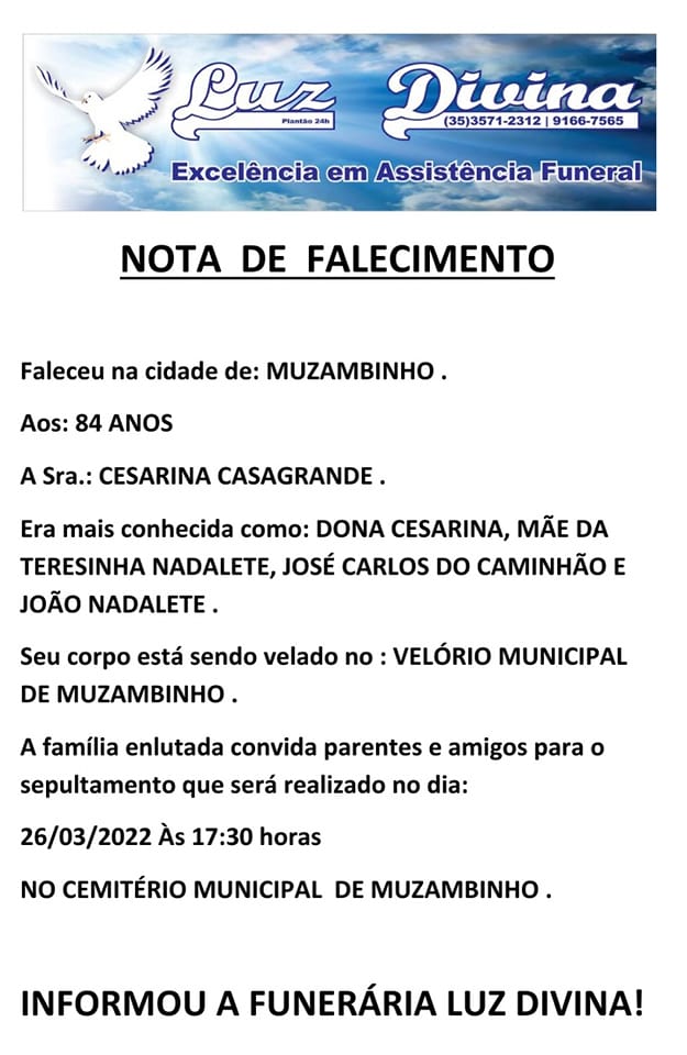 Mais Artigos Cozinha e CulináriaDestaqueNossa CidadeParceiros Sacolão Poscidônio prepara um fim de ano especial com frutas fresquinhas para o Natal DestaqueEsportesNossa Cidade Muzambinho promove 2º Pedal dos Cafés Especiais em prol da Casa Lar DestaqueDiversos ALERTA: Golpe do gov.br imita página do governo e usa CPF da própria vítima para enganá-la DestaqueObituárioFaleceu aos 84 anos, a Sra. Cesarina Casagrande Redação26 de março de 20221min0Informou a Funerária Luz Divina Post Views: 712 EnterroFuneráriaLuz DivinamorteobituárioSepultamentoVelório