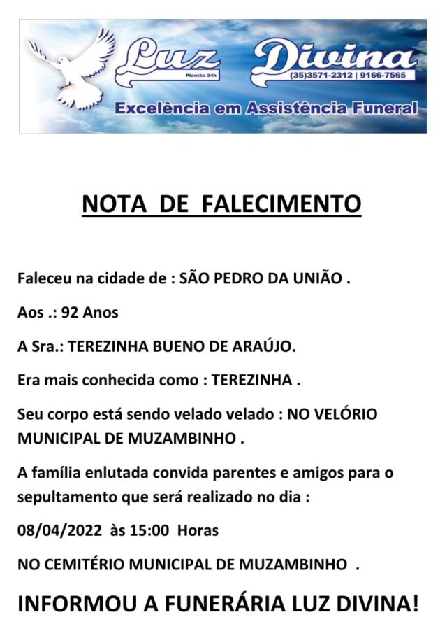 Mais Artigos AgronegócioDestaqueEducaçãoNossa Cidade ENCONTEC 2026 movimenta Muzambinho com inovação, tecnologia e integração entre comunidade e estudantes AgronegócioDestaqueNossa Cidade Muzambinho recebe 1º Encontro Regional de Cafeicultura Sustentável em maio Cozinha e CulináriaDestaqueParceiros Musa Laticínios amplia presença e leva sabor mineiro a diversos estados do BrasilDestaqueObituárioFaleceu aos 92 anos, a Sra. Terezinha Bueno de Araújo. Redação8 de abril de 20221min0Informou a Funerária Luz Divina Post Views: 840EnterroFuneráriaLuz DivinamorteobituárioSepultamentoVelório