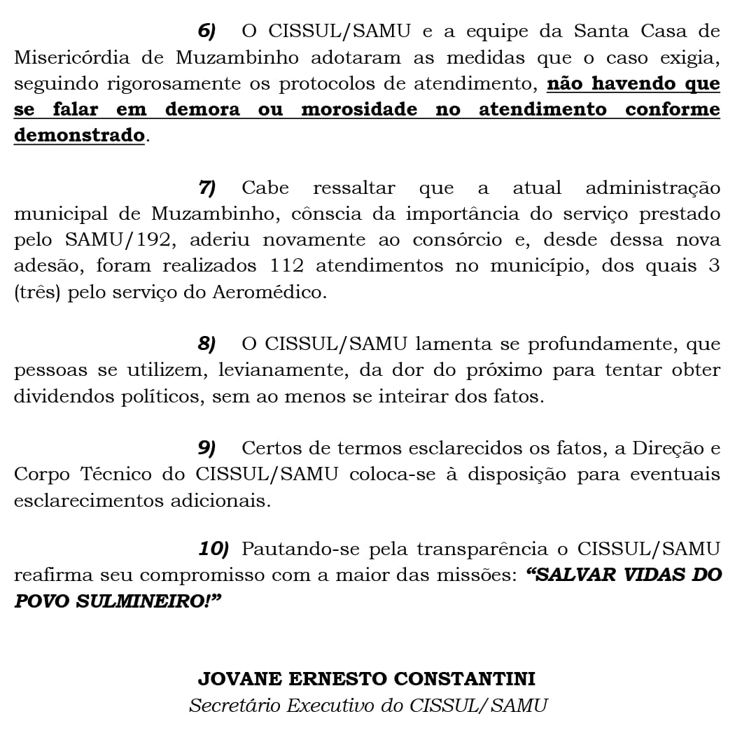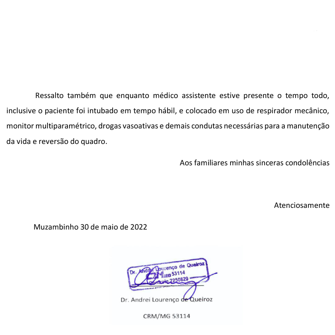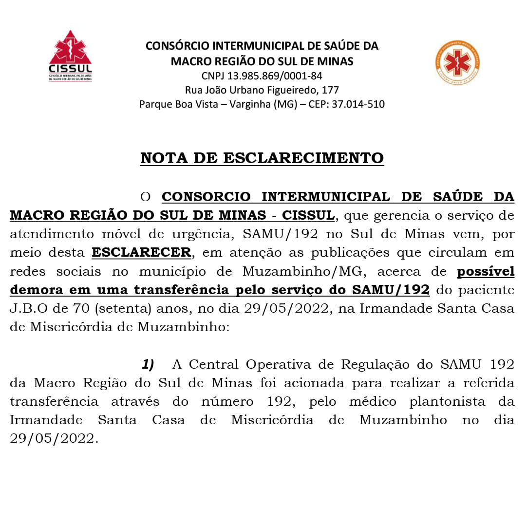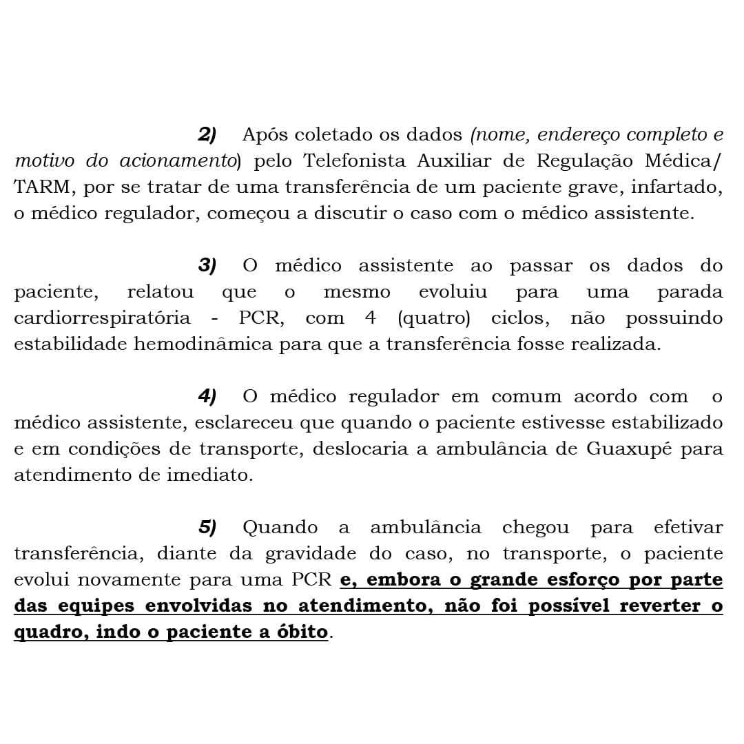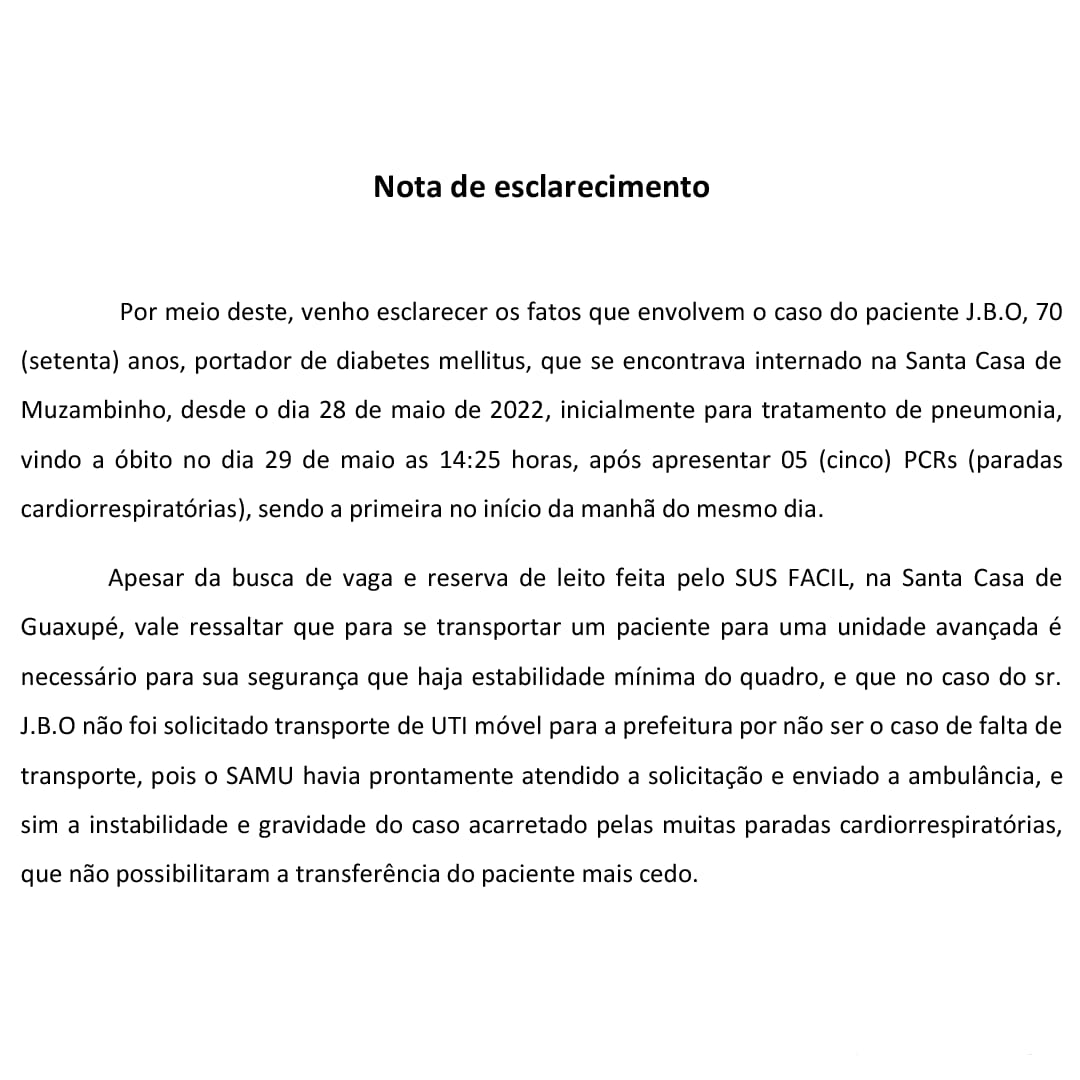 A Prefeitura de Muzambinho, por meio deste e pelas notas anexas, vem esclarecer à população que não foi solicitado transporte em nenhum momento para o paciente J.B.O., falecido em 29/05/2022, uma vez que o SAMU esteve à disposição do paciente desde que acionado e, segundo informações, só não foi realizado o transporte imediato pela falta de estabilização hemodinâmica.