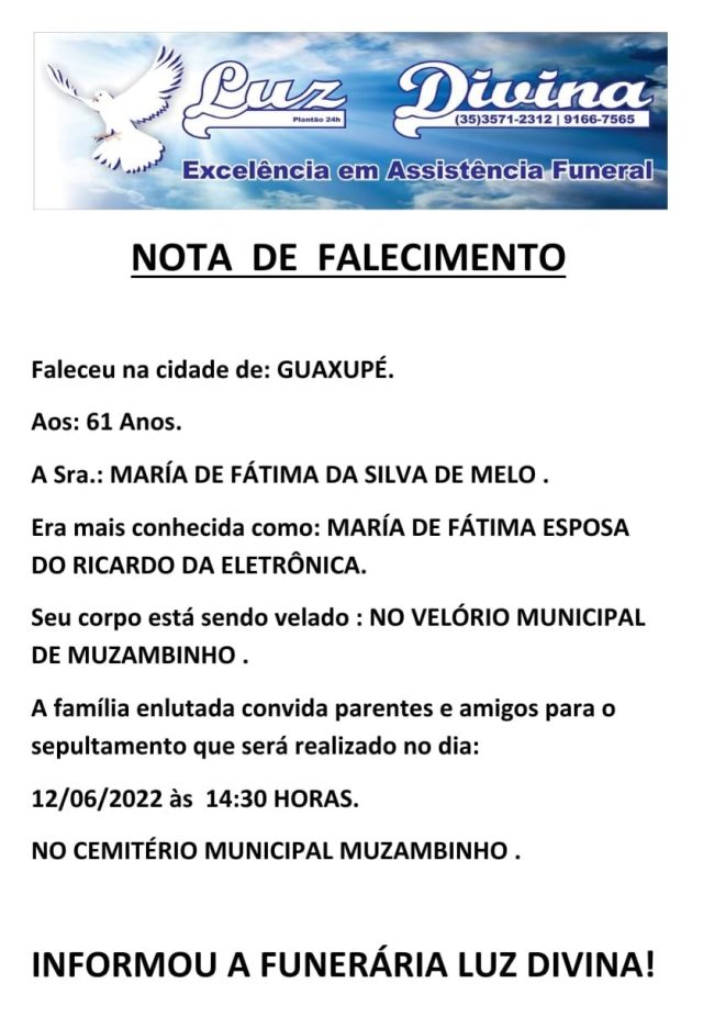 Mais Artigos DestaqueEconomia Quando será pago o 13º salário do INSS antecipado? DestaqueNosso EstadoSaúde Casos de dengue em MG sobem 23% em uma semana e chegam a 10 mil DestaqueObituário Faleceu aos 87 anos o Sr. Manoel Prospero dos ReisDestaqueObituárioFaleceu aos 61 anos, a Sra. Maria de Fátima da Silva de Melo Redação12 de junho de 20221min0Informou a Funerária Luz DivinaA família enlutada, nossos sinceros sentimentos de pesares, que Deus os abençoe e conforte. Post Views: 917EnterroFuneráriaLuz DivinamorteobituárioSepultamentoVelório