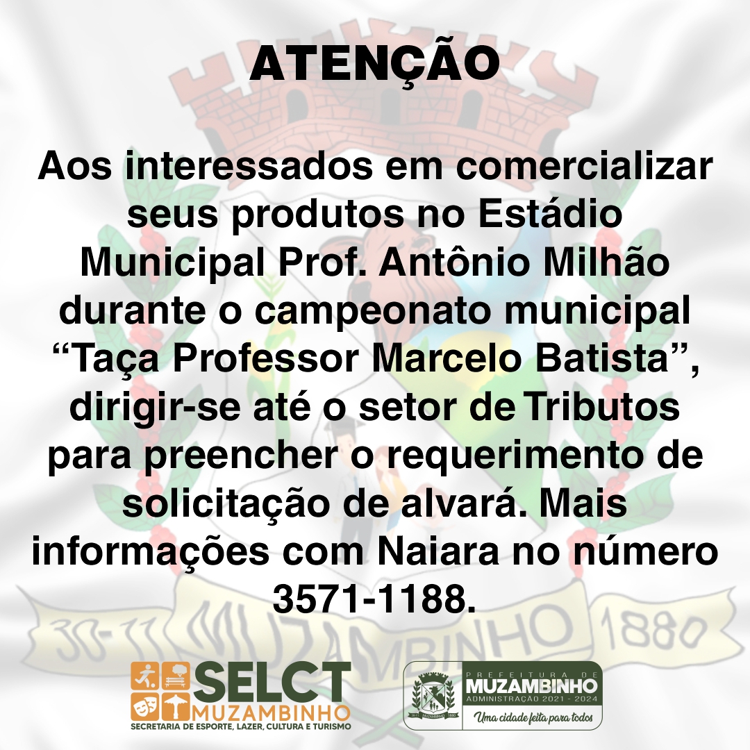 Mais Artigos DestaqueMensagens O Muzambinho.com deseja um Feliz Natal a todos os nossos internautas DestaqueEventos e FestasLazerNossa CidadeParceiros Sagrada Familia 11 anos – 20/12/25 DestaqueEconomiaPolítica Consumidor pagará menos na conta de luz em janeiro; saiba por quêDestaqueExecutivoNossa CidadeQuer comercializar produtos no Campeonato Municipal de Futebol ??? Redação14 de junho de 20221min0Procure a Prefeitura de Muzambinho, setor de Tributos. Post Views: 782campofutebolPrefeituraPrefeitura de Muzambinho