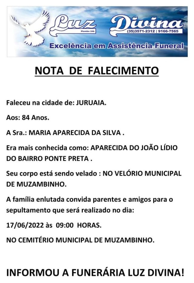 Mais Artigos DestaquePolítica Eleitor tem um mês para regularizar pendências e ficar apto a votar DestaqueObituário Faleceu aos 35 anos Fernanda Alexandra da Cruz DestaqueDiversosNossa Cidade Muzambinho não terá coleta de lixo nesta sexta-feira (03)DestaqueObituárioFaleceu aos 84 anos, a Sra. Maria Aparecida da Silva Redação17 de junho de 20221min0Informou a Funerária Luz DivinaA família enlutada, nossos sinceros sentimentos de pesares, que Deus os abençoe e conforte. Post Views: 932EnterroFuneráriaLuz DivinamorteobituárioSepultamentoVelório