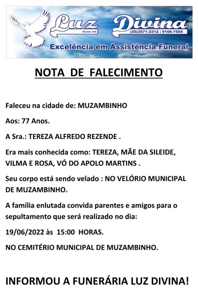 Mais Artigos DestaqueDiversosNossa Cidade Concurso “Rainha do Café 2026” abre inscrições em Muzambinho; candidatas podem se inscrever até 18 de março DestaquePrevisão do Tempo Mais de 700 cidades mineiras estão em alerta de perigo para chuvas intensas; Muzambinho está na lista DestaqueEconomiaPolítica Governo prevê multa de até R$ 500 milhões por aumento abusivo de combustíveisDestaqueObituárioFaleceu aos 77 anos, a Sra. Tereza Alfredo Resende Redação19 de junho de 20221min0Informou a Funerária Luz Divina A família enlutada, nossos sinceros sentimentos de pesares, que Deus os abençoe e conforte. Post Views: 896EnterroFuneráriaLuz DivinamorteobituárioSepultamentoVelório