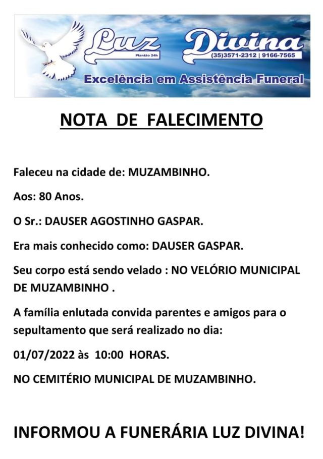 Mais Artigos DestaqueEconomia Imposto de Renda 2026: tudo o que você precisa saber antes de declarar DestaqueNosso EstadoSaúde A cada 9 segundos, MG registra uma internação por consequências do diabetes Cozinha e CulináriaDestaqueNossa CidadeParceiros Domingo combina com pizza! Hoje é dia de aproveitar!DestaqueObituárioFaleceu aos 80 anos, o Sr. Dauser Agostinho Gaspar Redação30 de junho de 20221min0Informou a Funerária Luz DivinaA família enlutada, nossos sinceros sentimentos de pesares, que Deus os abençoe e conforte. Post Views: 882EnterroFuneráriaLuz DivinamorteobituárioSepultamentoVelório