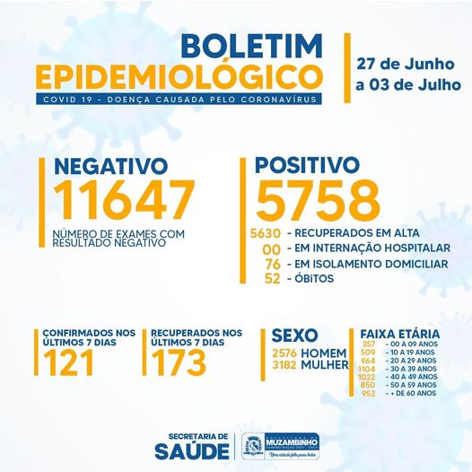 No período de 27 de Junho a 03 de Julho, confirmamos o resultado positivo para Covid-19 de Cento e Vinte e Um pacientes em Muzambinho, sendo 42 do sexo masculino e 79 do sexo feminino.
