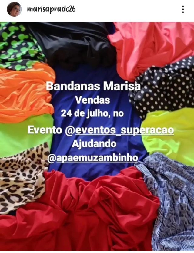 Serão vendidas no dia as Bandanas Marisa, e toda a renda arrecadada com a venda das Bandanas será repassada para a APAE de MUZAMBINHO.