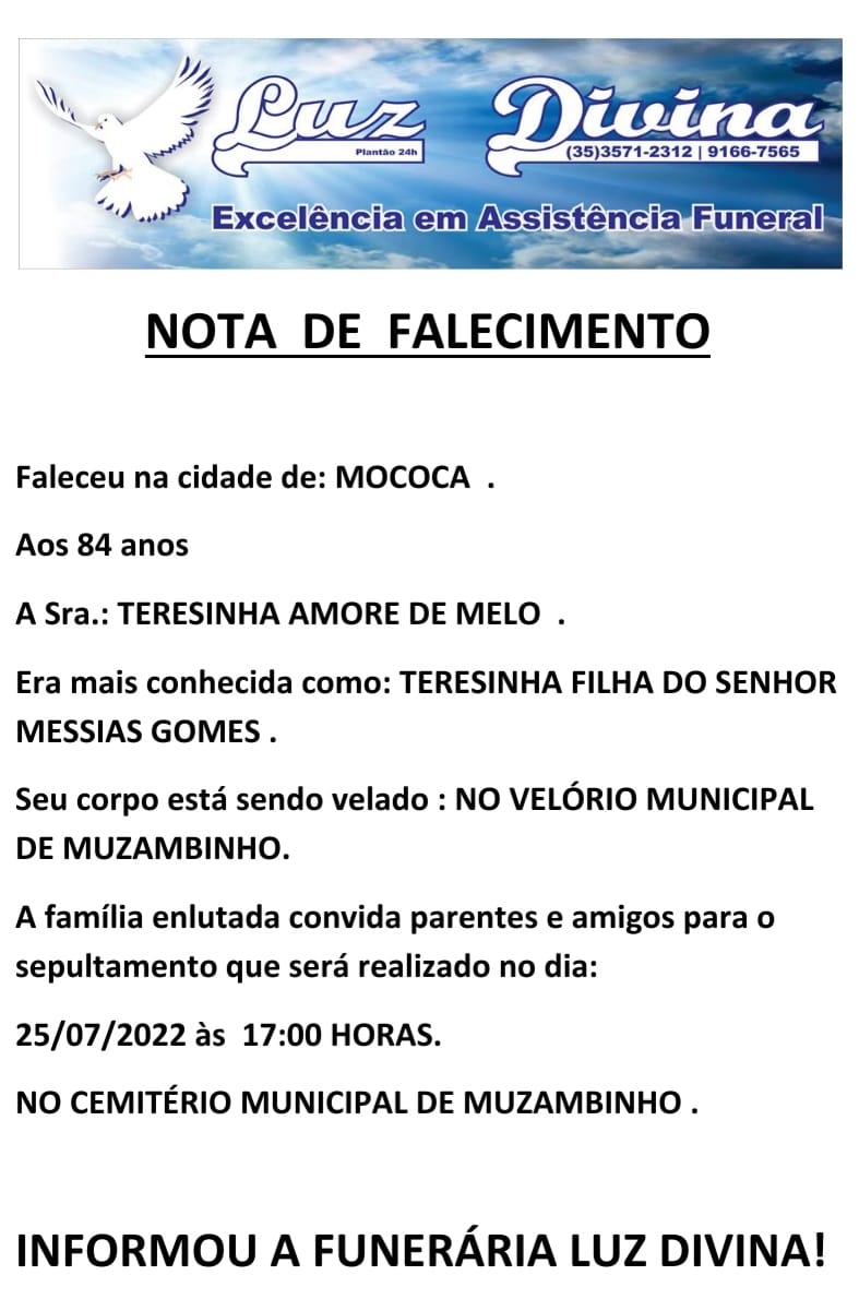 Mais Artigos Cozinha e CulináriaDestaqueNossa CidadeParceiros Lombo Recheado Natalino – esta Receita vai deixar todos com água na boca. DestaqueEventos e FestasNossa Cidade Emize Skate Festival chega à 5ª edição em novo espaço no Parque Colina DestaqueParceiros Sicredi terá horário diferenciado de atendimento no final do anoDestaqueObituárioFaleceu aos 84 anos, a Sra. Teresinha Amore de Melo Redação25 de julho de 20221min0Informou a Funerária Luz DivinaA família enlutada, nossos sinceros sentimentos de pesares, que Deus os abençoe e conforte. Post Views: 773EnterroFuneráriaLuz DivinamorteobituárioSepultamentoVelório