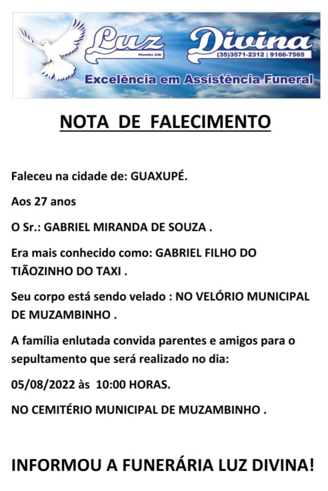 Mais Artigos DestaqueDiversosNossa Cidade Muzambinho não terá coleta de lixo nesta sexta-feira (03) AcidenteDestaque Empresária de Muzambinho morre em grave acidente na BR-146 DestaquePrevisão do Tempo Mais de 70% de Minas está em alerta para temporal até sábado; veja orientaçõesDestaqueObituárioFaleceu aos 27 anos, Gabriel Miranda de Souza Redação5 de agosto de 20221min0Informou a Funerária Luz Divina A família enlutada, nossos sinceros sentimentos de pesares, que Deus os abençoe e conforte. Post Views: 957EnterroFuneráriaLuz DivinamorteobituárioSepultamentoVelório