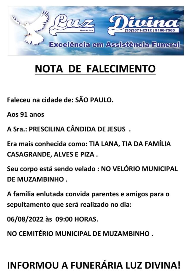 Mais Artigos CulturaDestaqueNossa Cidade Exposição homenageia legado do artista Pedro Pioli Netto na Casa da Cultura de Muzambinho AgronegócioDestaque Café em Foco, 11/03/26, Cotações e Informações da Cafeicultura DestaqueEventos e FestasParceiros Música ao vivo neste sábado no Bar do Edmar – Sagrada FamíliaDestaqueObituárioFaleceu aos 91 anos, a Sra. Prescilina Cândida de Jesus Redação5 de agosto de 20221min0Informou a Funerária Luz Divina A família enlutada, nossos sinceros sentimentos de pesares, que Deus os abençoe e conforte. Post Views: 870EnterroFuneráriaLuz DivinamorteobituárioSepultamentoVelório