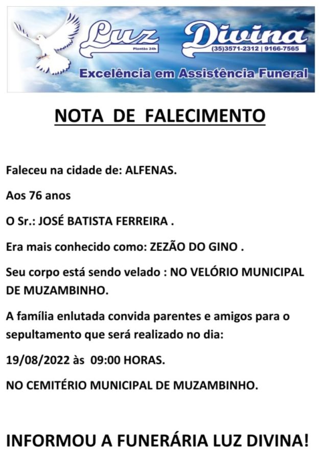 Mais Artigos DestaqueEventos e FestasLegislativoNossa Cidade Câmara de Muzambinho homenageia mulheres trabalhadoras em sessão solene Cozinha e CulináriaDestaqueNossa CidadeParceiros Queijos Recheados e Trufados Musa: sabor surpreendente e apresentação que conquista o cliente DestaqueDiversosNossa Cidade Concurso “Rainha do Café 2026” abre inscrições em Muzambinho; candidatas podem se inscrever até 18 de marçoDestaqueObituárioFaleceu aos 76 anos, o Sr. José Batista Ferreira – Zezão do Gino Redação19 de agosto de 20221min0Informou a Funerária Luz Divina A família enlutada, nossos sinceros sentimentos de pesares, que Deus os abençoe e conforte. Post Views: 787EnterroFuneráriaLuz DivinamorteobituárioSepultamentoVelório